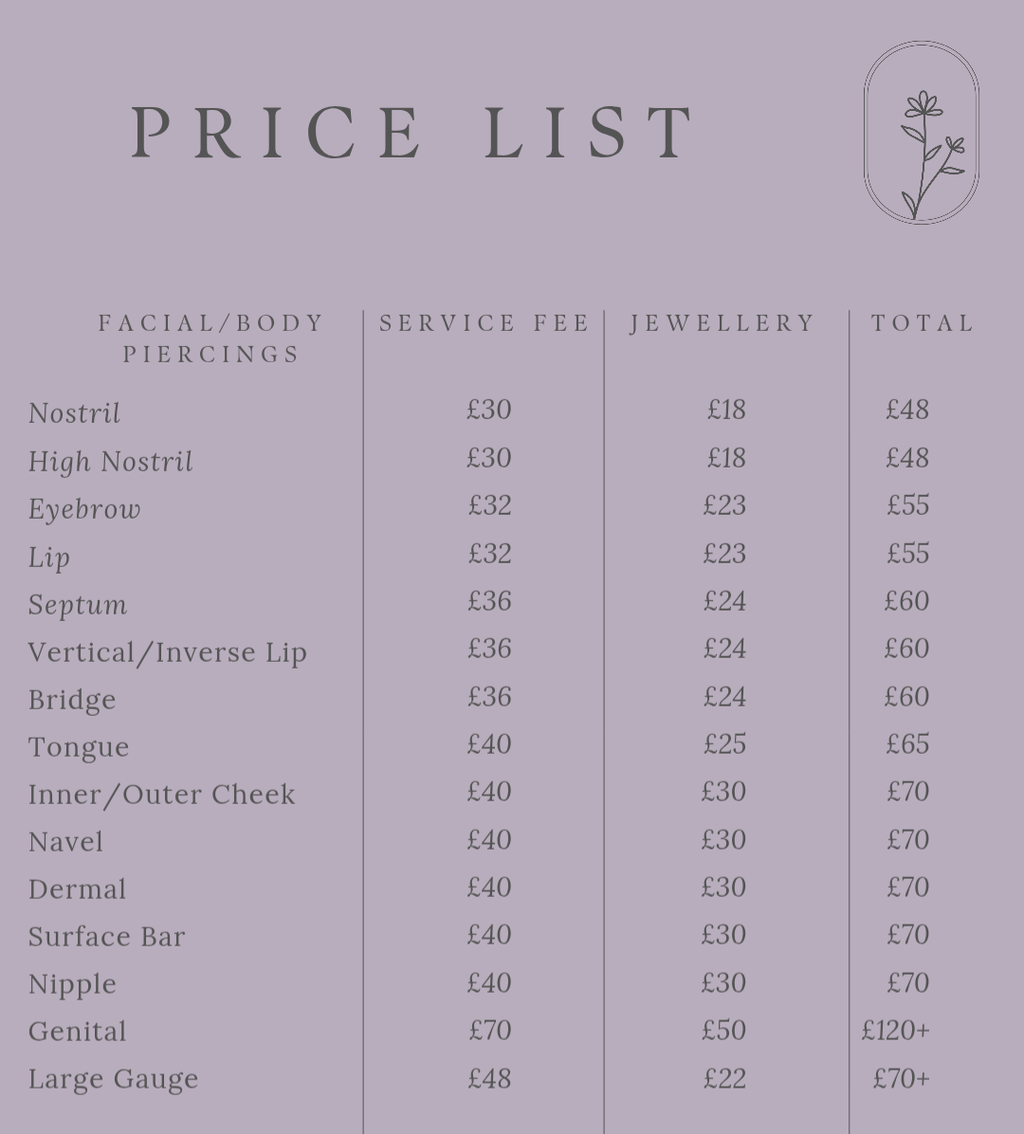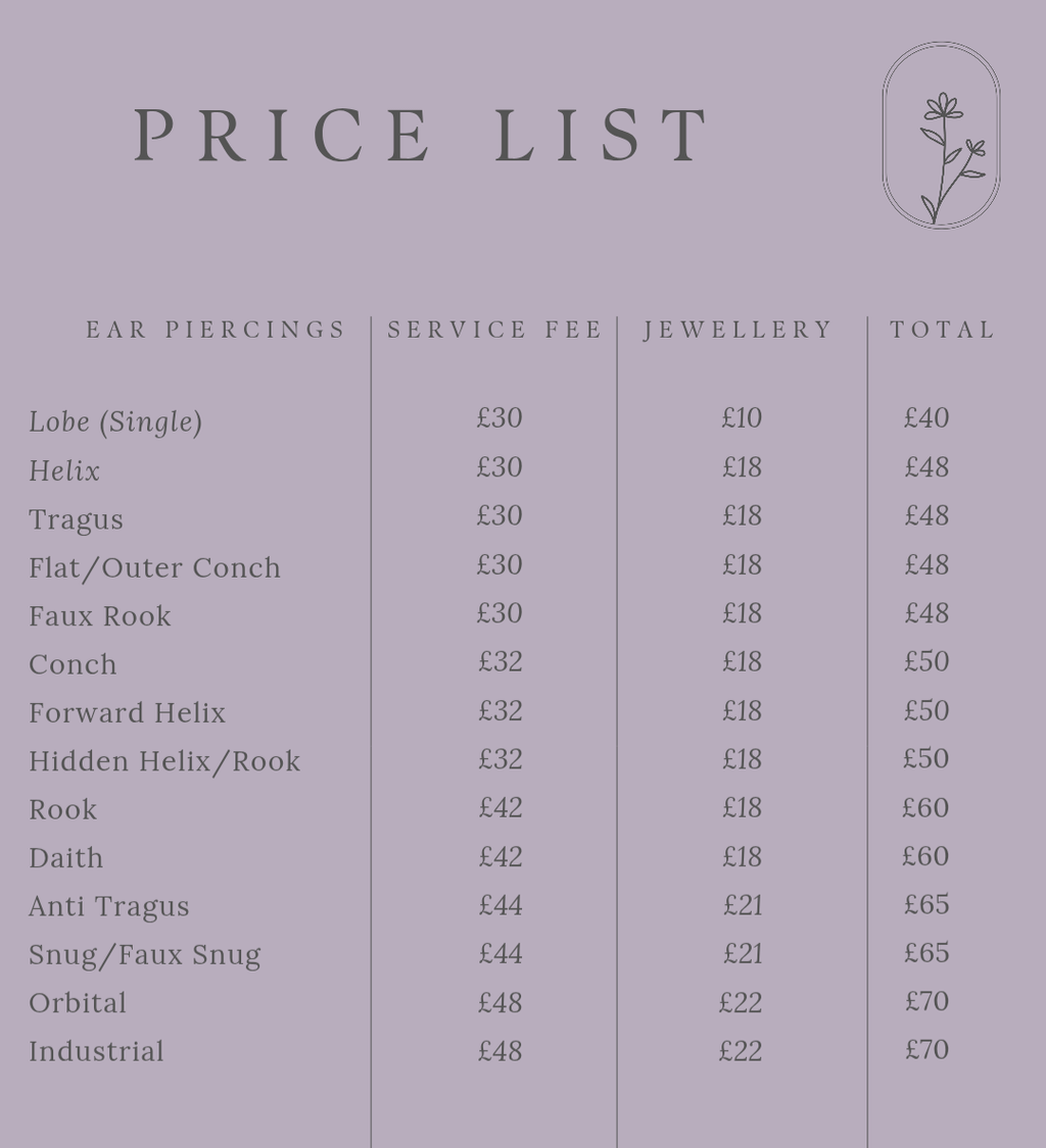 All piercings are priced below with basic jewellery included, if unsure please email.